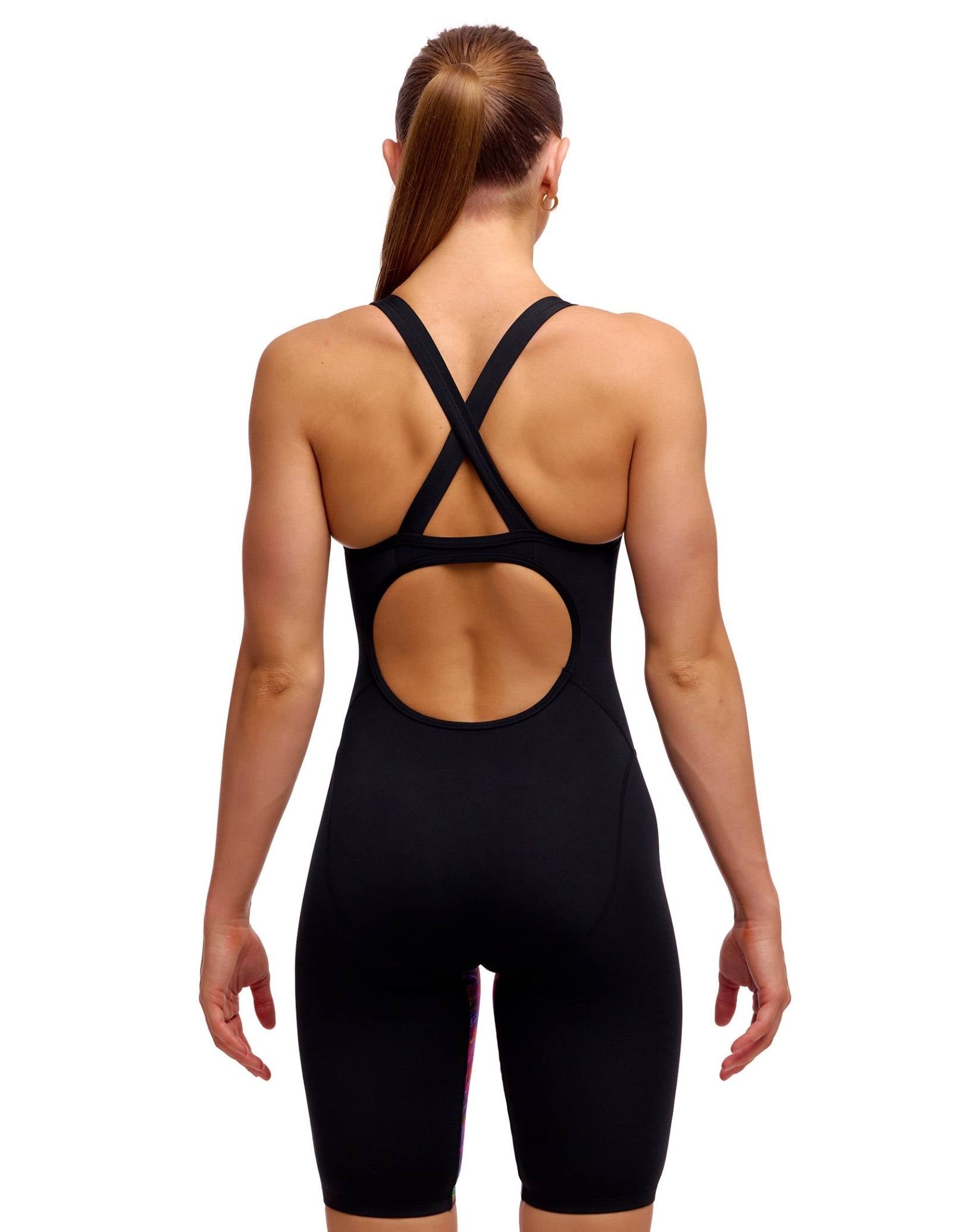 The Big Bang Fast Training One Piece Legsuit merges Funkita's technical expertise with an explosive pattern in blues, pinks and blacks at the front of the legsuit and a solid black at the back. Wide black, crossed, shoulder straps and comprehensive upper leg coverage work together to stabilise your stroke, letting you concentrate on training intensity. The precision-engineered panelling creates a contoured profile that responds naturally to your body's movements in the water. Constructed from ECO-C Infinity, a fully chlorine-resistant fabric derived from recycled plastics, this legsuit withstands rigorous pool use whilst maintaining colour vibrancy and structural integrity season after season.