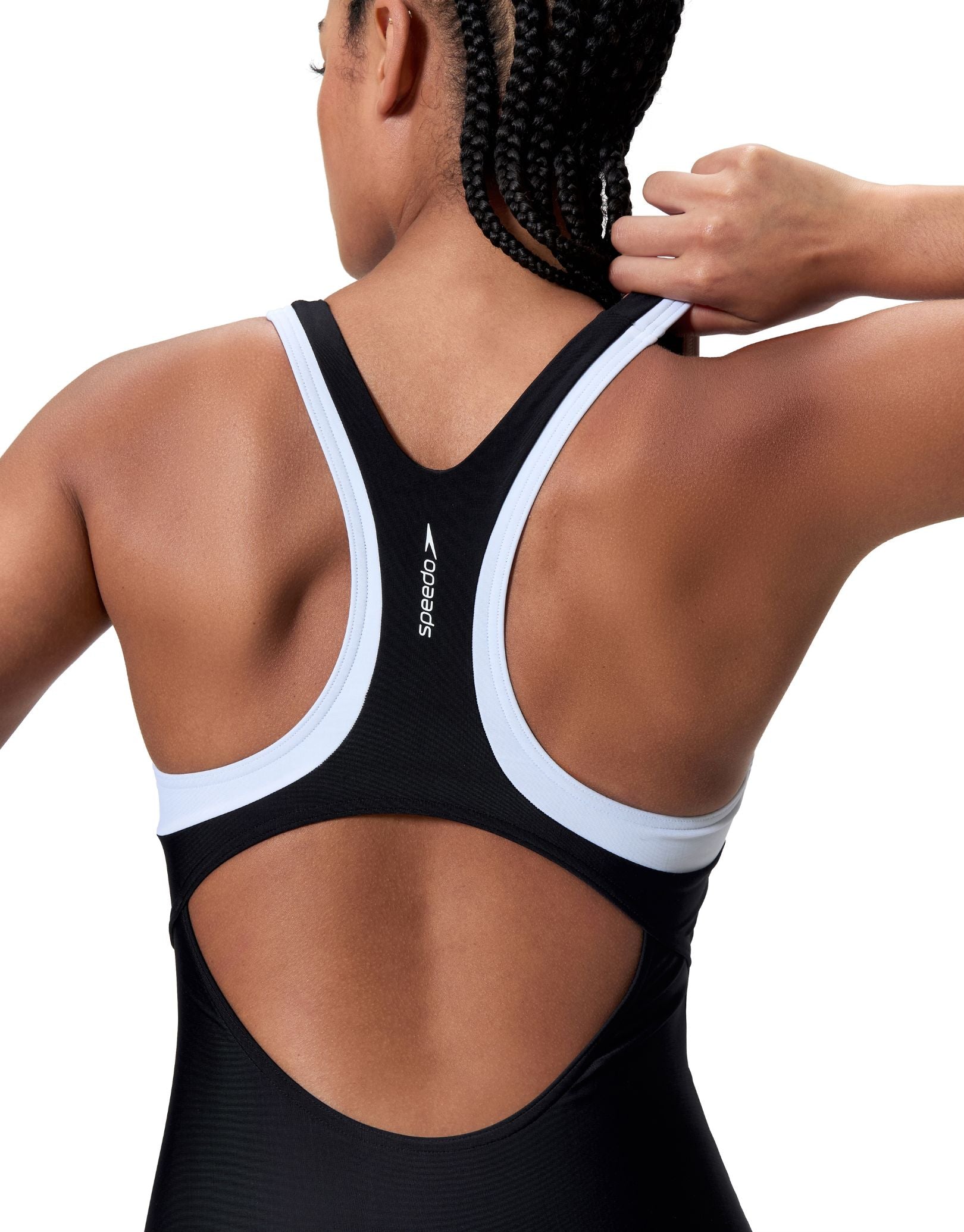 This striking Speedo Colourblock Racerback swimsuit combines sleek monochrome styling with serious performance credentials. The racerback design in black with white highlights and thin straps delivers unrestricted shoulder mobility, ideal for dedicated swimmers. A structured shelf bra featuring removable cups ensures reliable support throughout your training sessions. Built with XLANCE® technology, the fabric resists chlorine degradation whilst offering two-way stretch for a consistently comfortable fit that maintains its shape lap after lap.