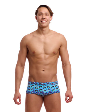 The Jack Stack Sidewinder Swim Trunks from Funky Trunks are designed with stylish geometric prints in blue. The wide elastic leg opening and waistband offer added comfort while the drawcord ensures a secure and comfortable fit. Made from durable ECO C-Infinity fabric, the trunks are highly chlorine-resistant and long-lasting.