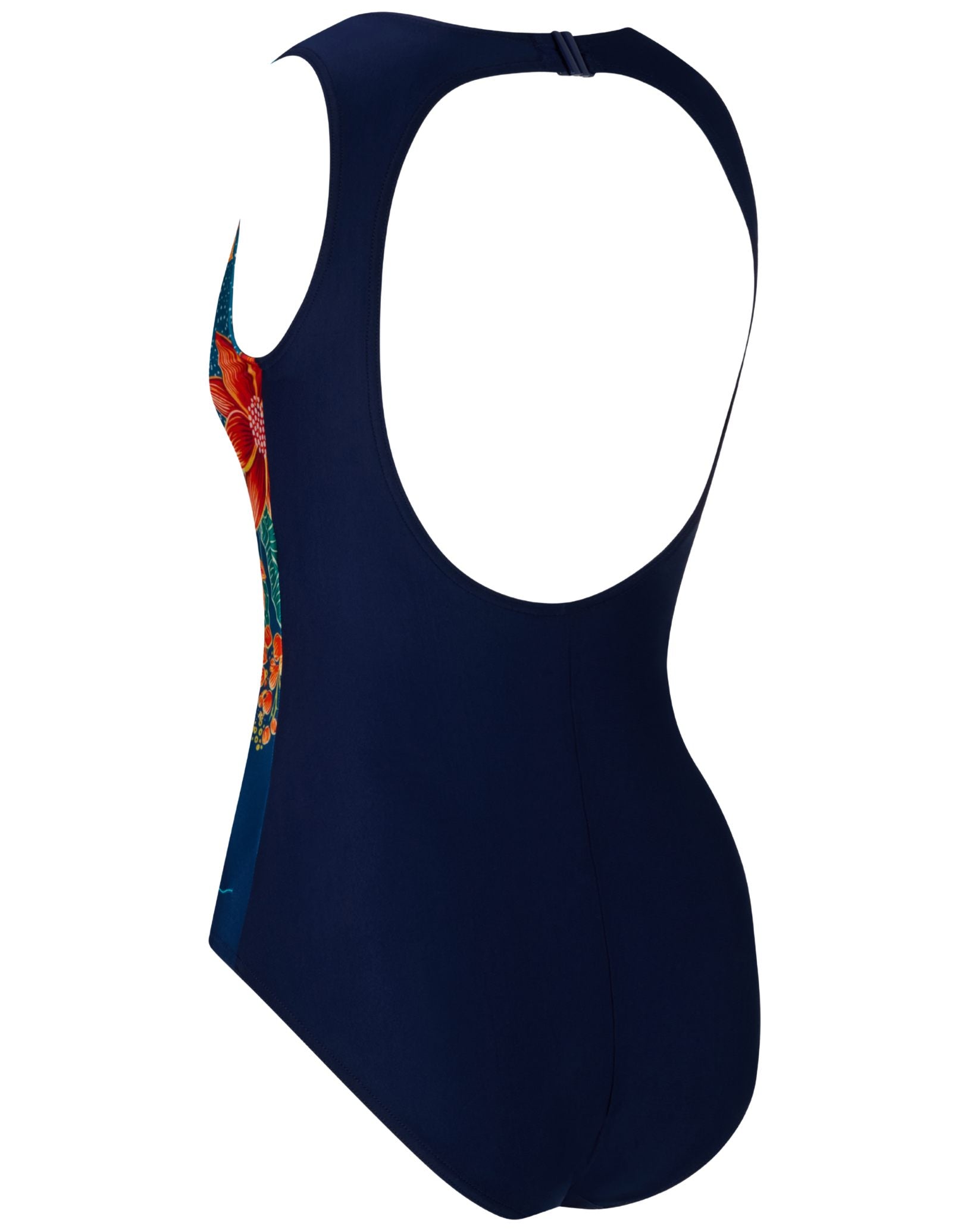 Discover the Mandira Hi Front Swimsuit from Zoggs, where striking design meets everyday comfort. Zoggs' eye-catching pattern features tropical flowers and leaves to the front, on a rich blue background. The thoughtfully designed high front neckline and mid-rise leg offer flattering coverage for all body types. Built with a supportive shelf bra and secure clipback fastening, this swimsuit keeps you confident in and out of the water. Crafted from durable Ecolast fabric, it resists chlorine damage, making it the perfect choice for regular swimmers seeking style without compromise.