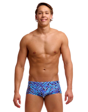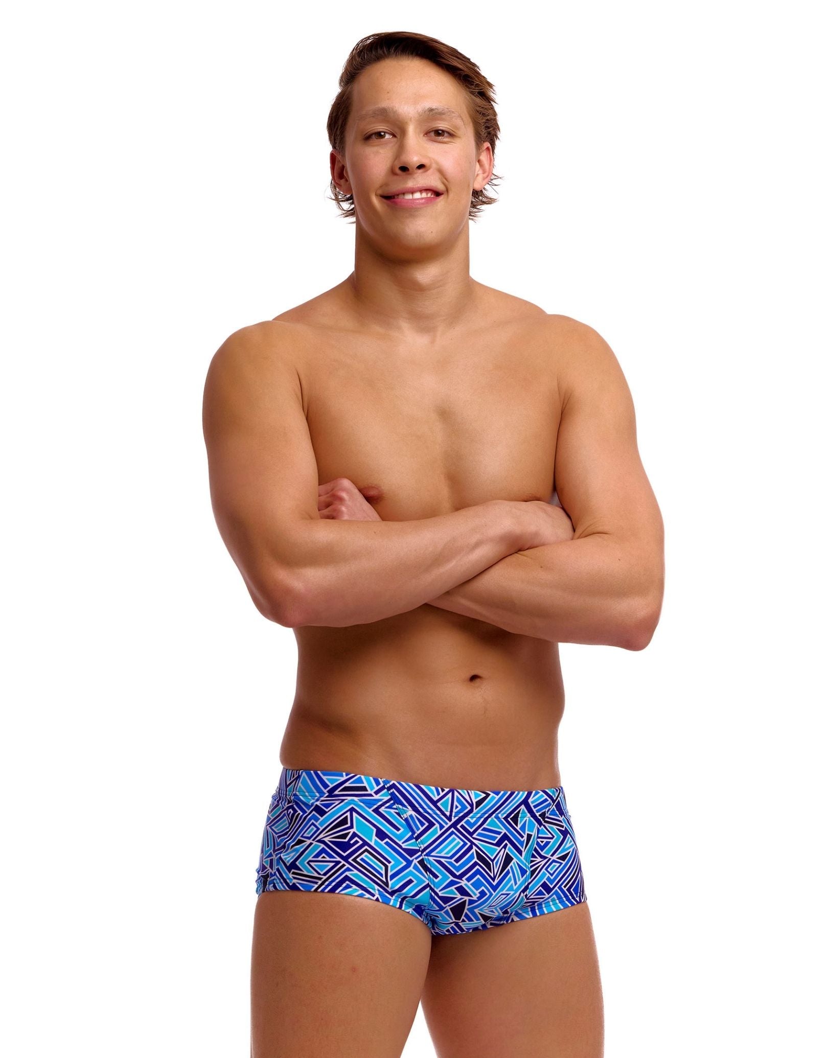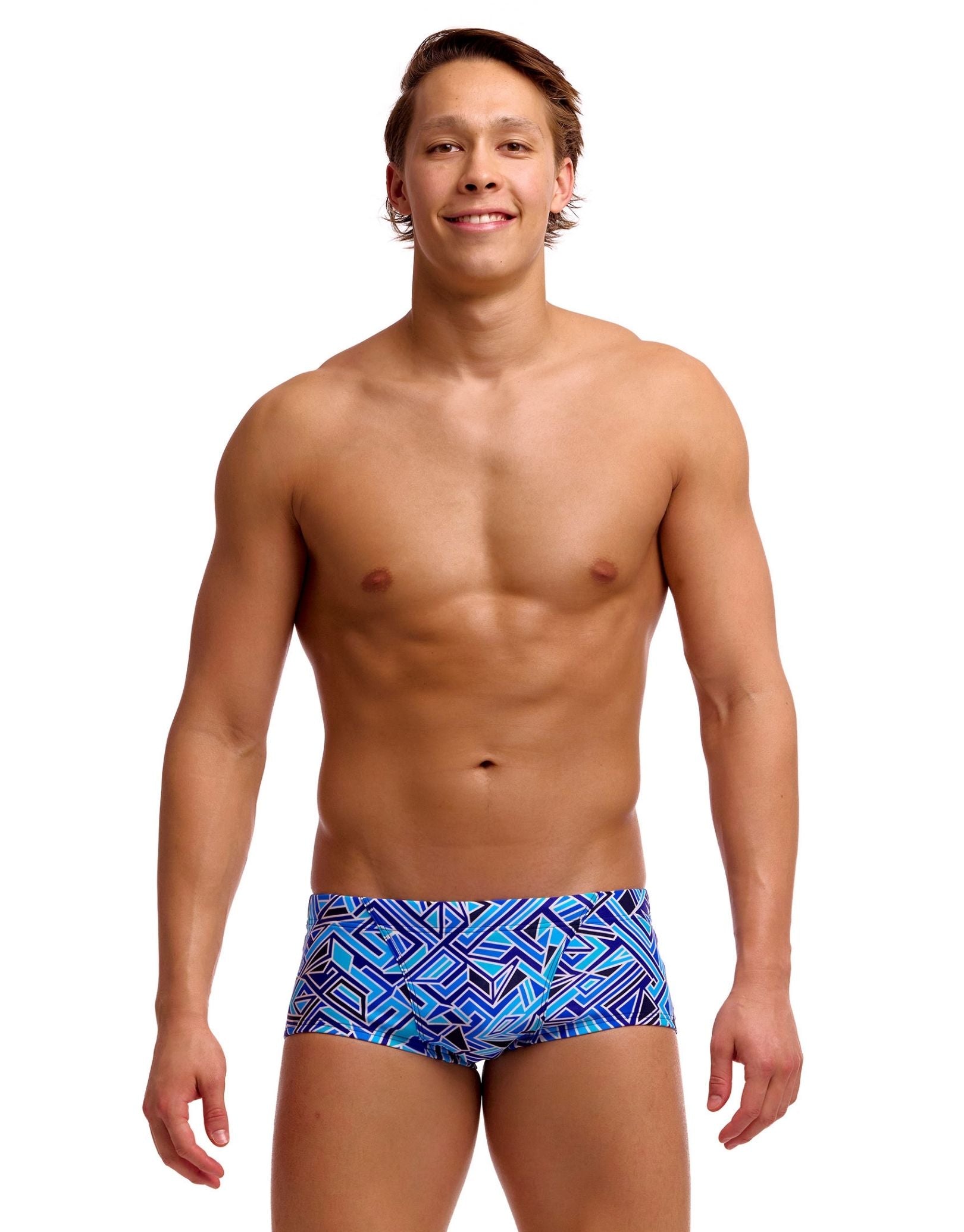 Engineered for serious swimmers, the Blue Bits Classic Swim Trunk from Funky Trunks, with geometric shapes in blue, white and cyan, they deliver reliable performance across training sessions and competitive use. The reinforced front pouch with double-lined construction provides essential support, while generously cut leg openings enhance freedom of movement. An adjustable drawcord locks in a secure fit even during intense activity. Built from ECO C-Infinity fabric, these trunks resist chlorine degradation exceptionally well and maintain their integrity through countless pool hours.