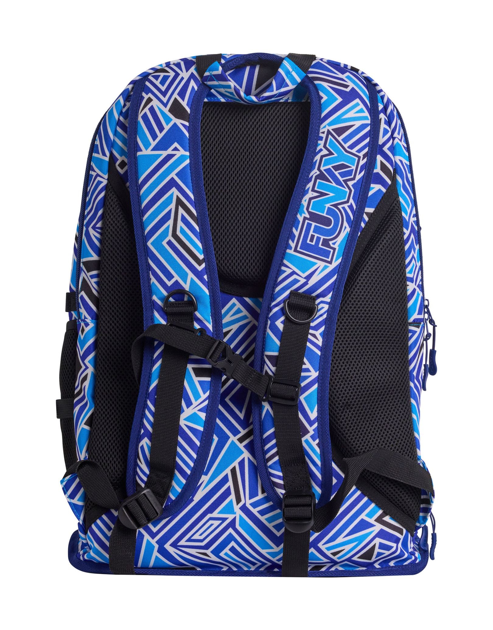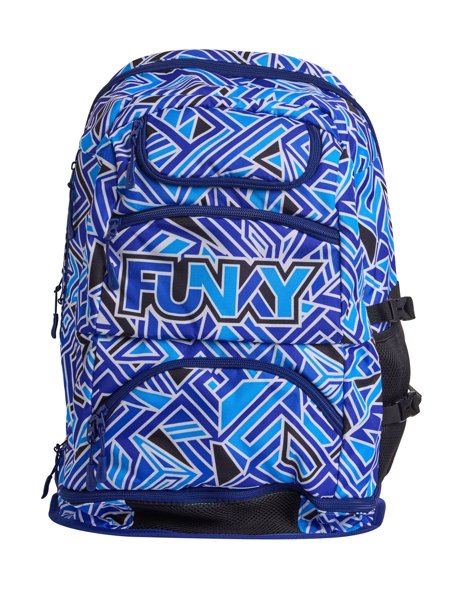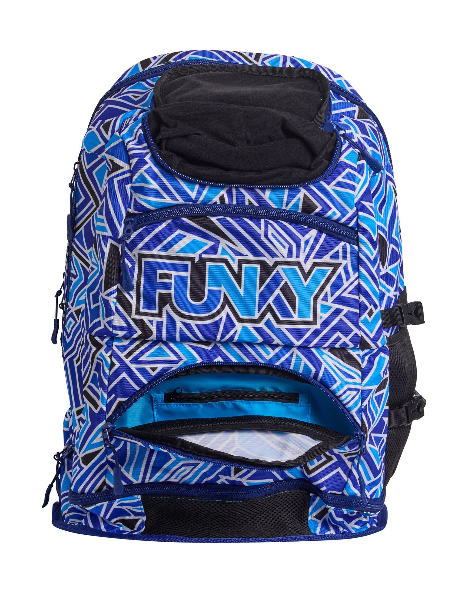The Blue Bits Elite Squad 36L Backpack by Funky Trunks features eye-catching blue prints, combining style with ultimate swim gear organisation. With a 36L capacity, it includes a fabric-lined goggles compartment, a waterproof base for shoes or wet towels, mesh sections, a cooler pocket, and a large laptop section. Padded shoulder straps, a chest strap, and a comfortable back panel make it perfect for swimmers on the go.