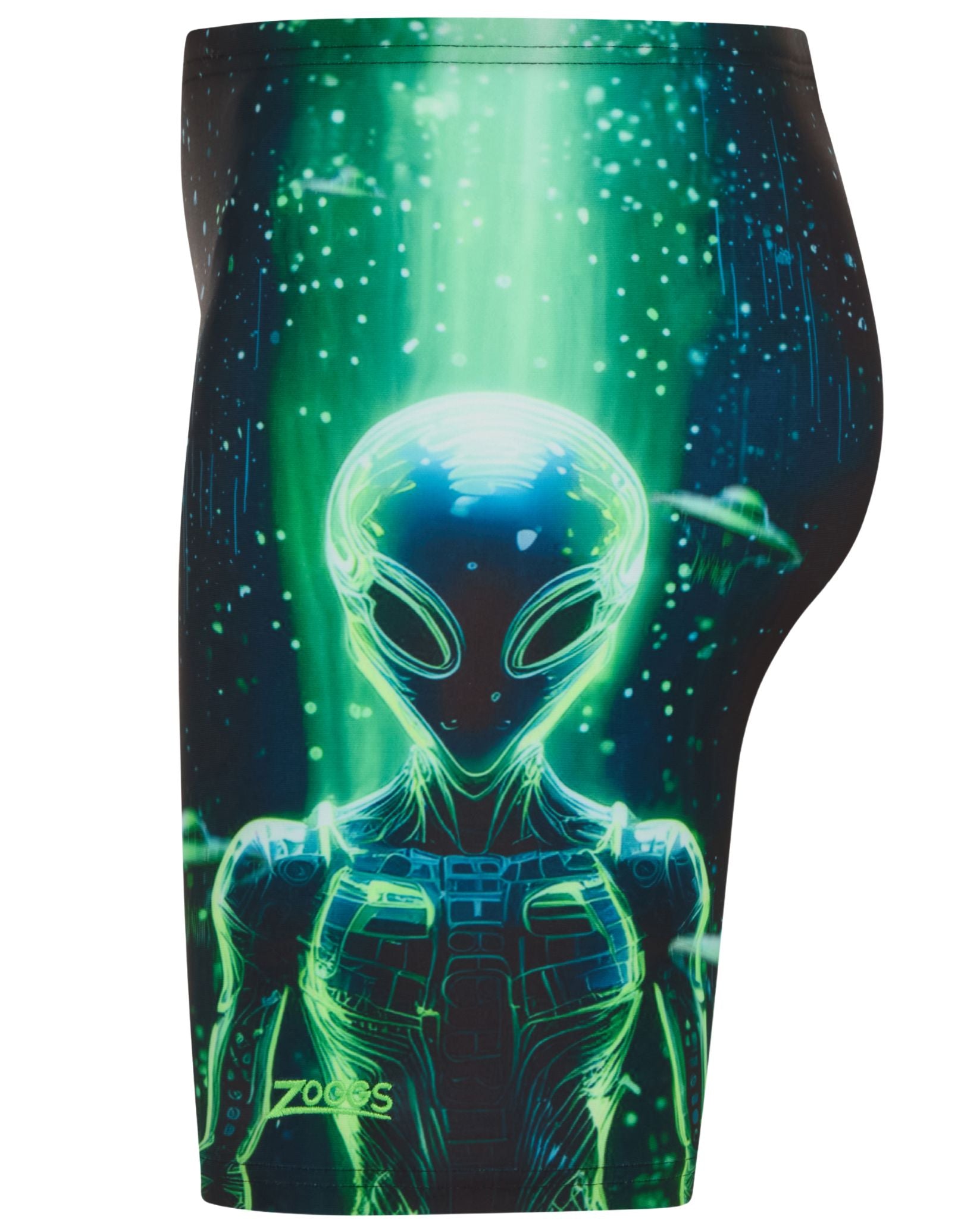 The Zoggs Boys XFile Mid Swim Jammer combines performance with eye-catching style. Featuring a striking alien graphic on the front, these black and green jammers deliver the support and comfort young swimmers need. The triangle front lining ensures optimal fit during training and competition, while the durable Ecolast fabric resists chlorine degradation for extended wear. Ideal for swimmers seeking reliable, chlorine-resistant swimwear that doesn't compromise on design.