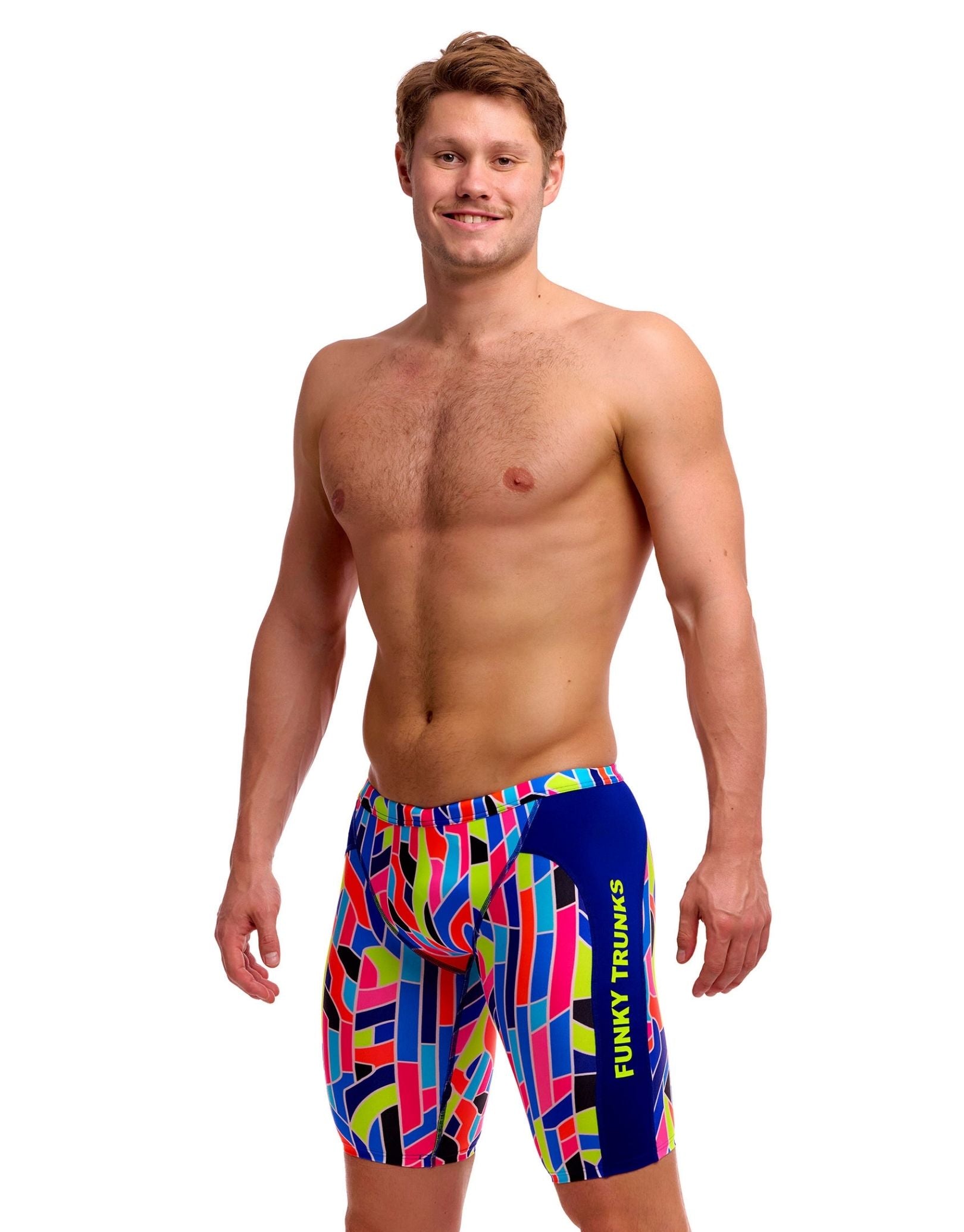Built for serious swimmers, the Fault Lines Swim Training Jammer from Funky Trunks, features geometric patterns in blue, pink and lime greens, there is a bright blue dynamic panel down one side, delivers visual appeal. The ECO C-Infinity fabric resists chlorine degradation whilst maintaining its integrity through intensive training regimens. Generously cut leg openings reduce restriction during extended pool sessions, whilst the reinforced waistband with drawcord adjustment ensures stability without compromising comfort.
