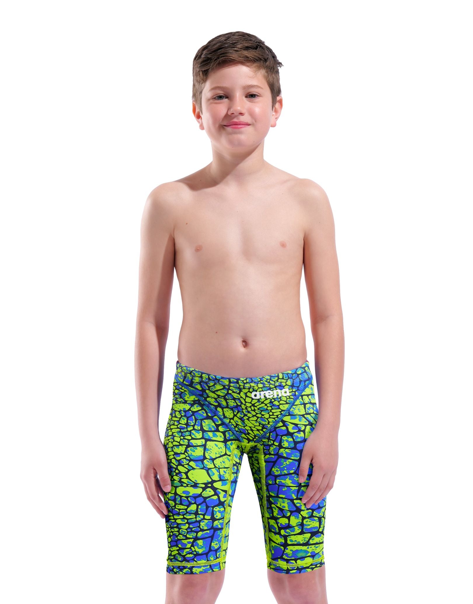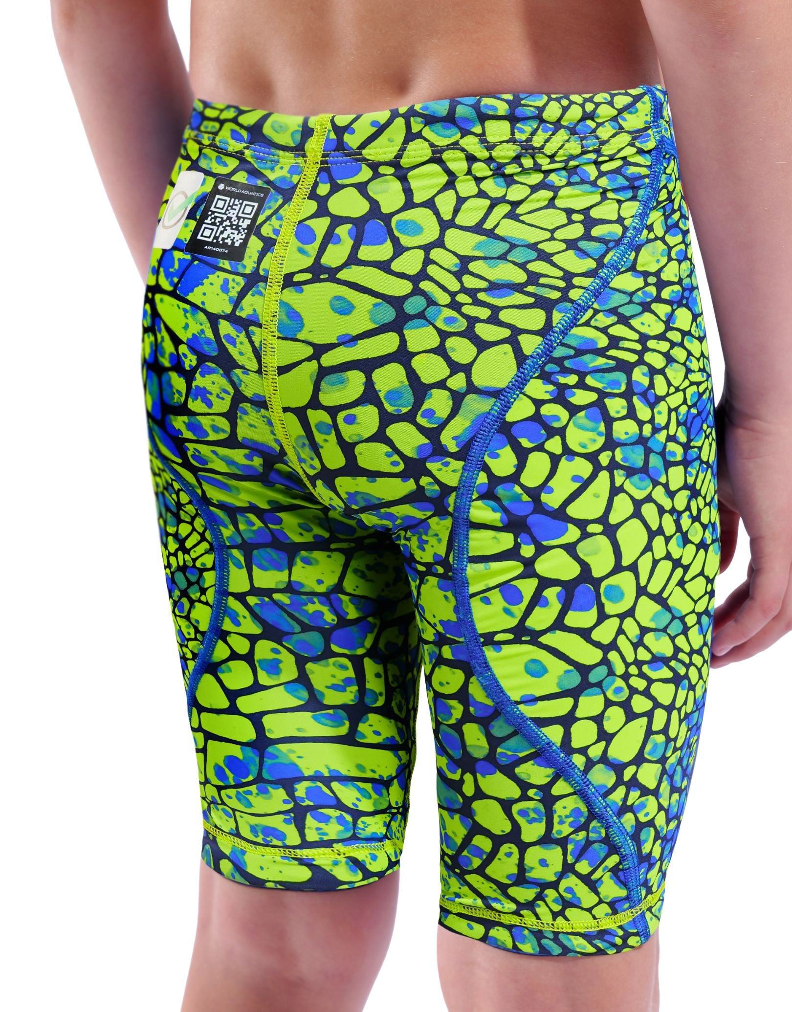 The Powerskin ST NEXT Boys Jammer from Arena in the limited edition green snakeskin print is a World Aquatics-approved racing suit made with over 60% recycled fabric from pre- and post-consumer textile waste. Engineered to be 20% lighter and more durable, it reduces drag and water absorption for enhanced speed and performance. With a design that supports full range of motion and easy water entry, it’s the ideal first race suit for young, aspiring swimmers.