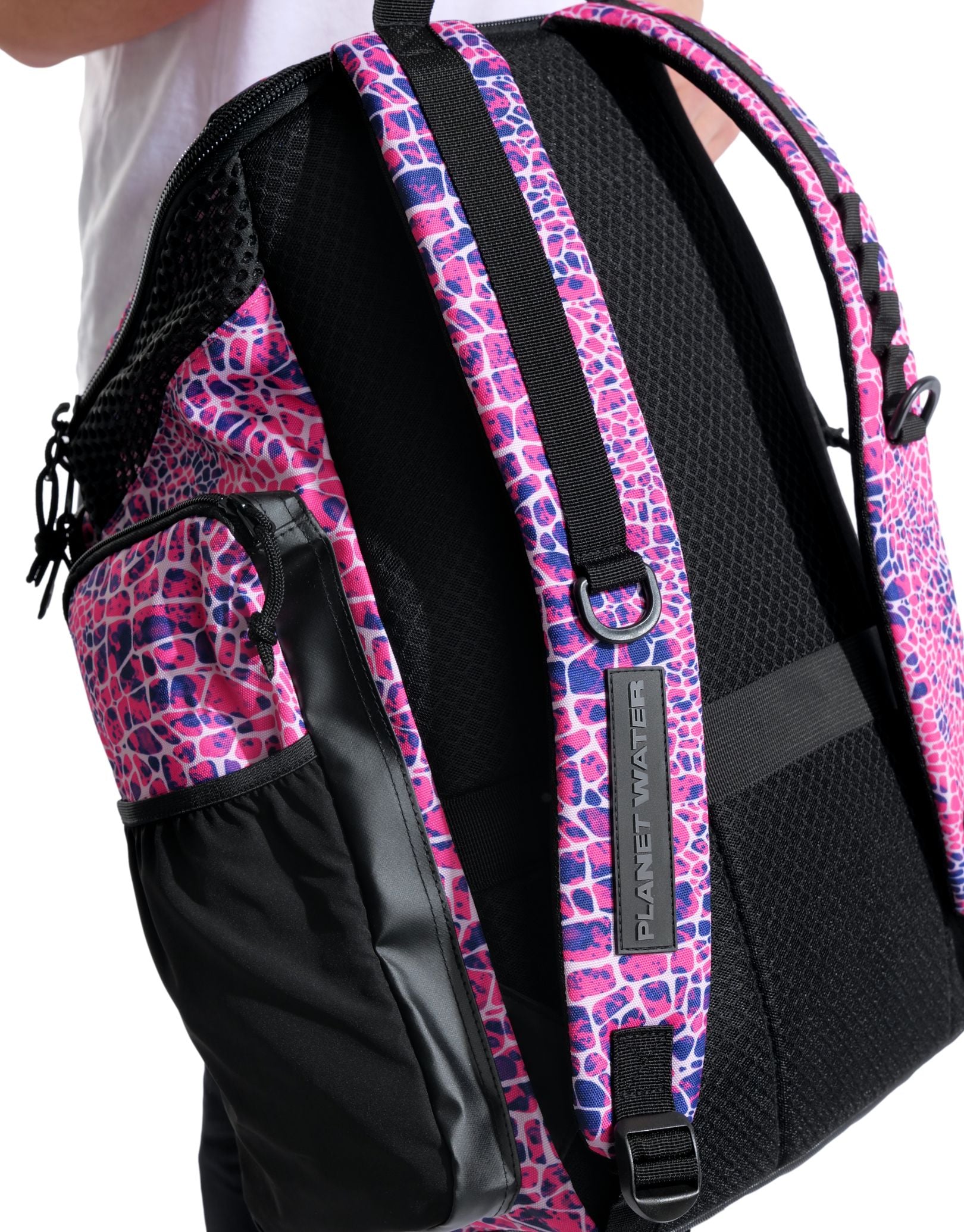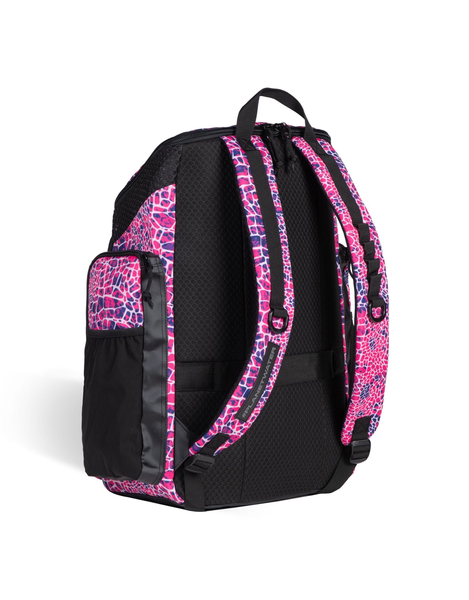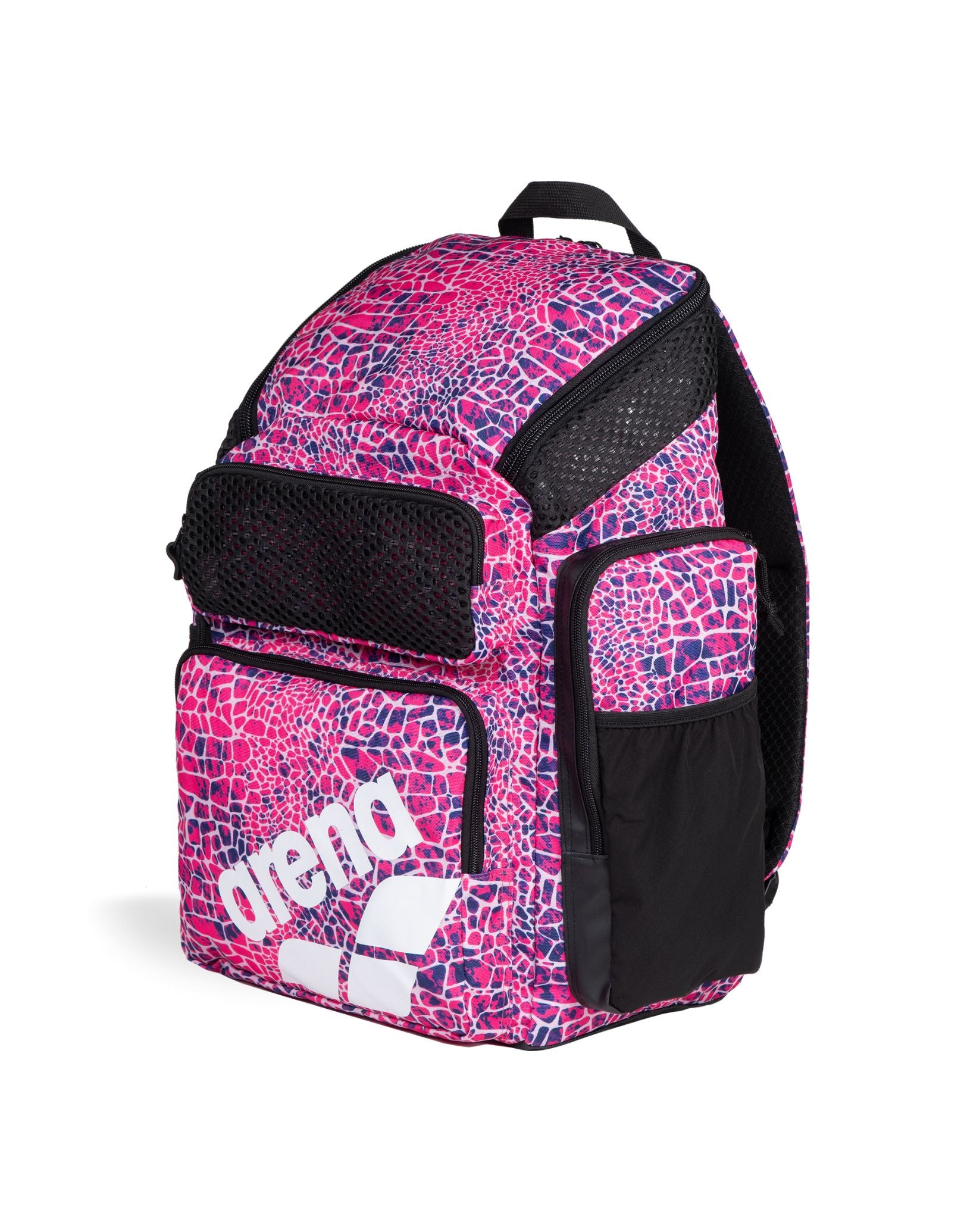 The Snakeskin Green One Go 45L Backpack from Arena showcases a bold pink snakeskin print, blending eye-catching style with high-performance functionality for swimmers and athletes. Built with water-repellent fabric and moisture-control technology, it features a roomy top-loading main compartment and four zipped exterior pockets to keep gear dry and organized. Complete with a laptop sleeve and trolley strap, this versatile swim backpack is ideal for training, competition, and travel.