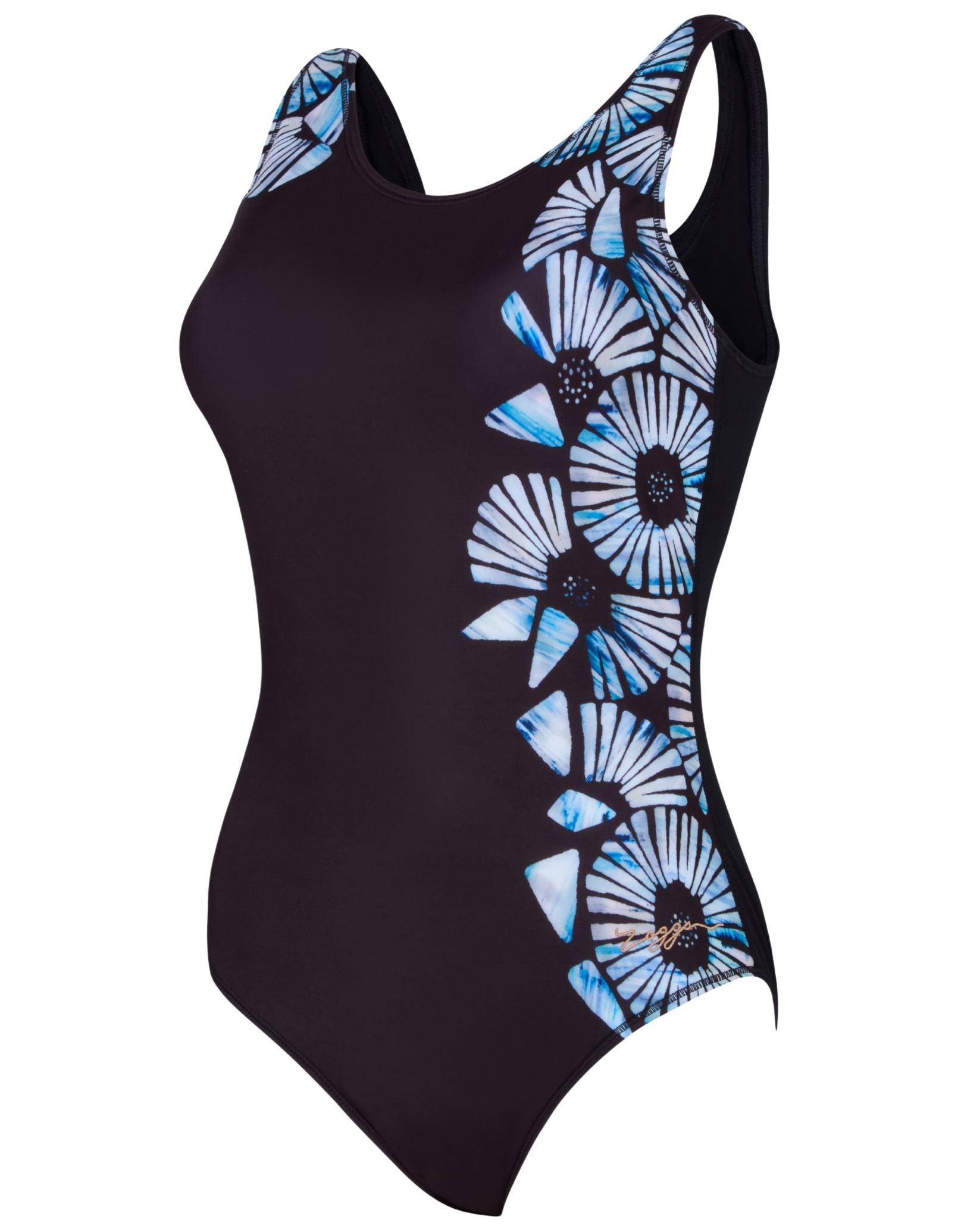 Discover effortless elegance with the Moonstone Scoopback Swimsuit by Zoggs. This stunning design combines a bold geometric leaf and flower motif against a sophisticated black base, creating a look that turns heads poolside. Built with supportive foam cups and front lining for confidence and comfort, the medium leg cut provides the perfect balance of coverage and style. Crafted from premium Ecolast fabric, it resists chlorine damage while maintaining its shape season after season - the ideal companion for swimmers who refuse to compromise on durability or design.