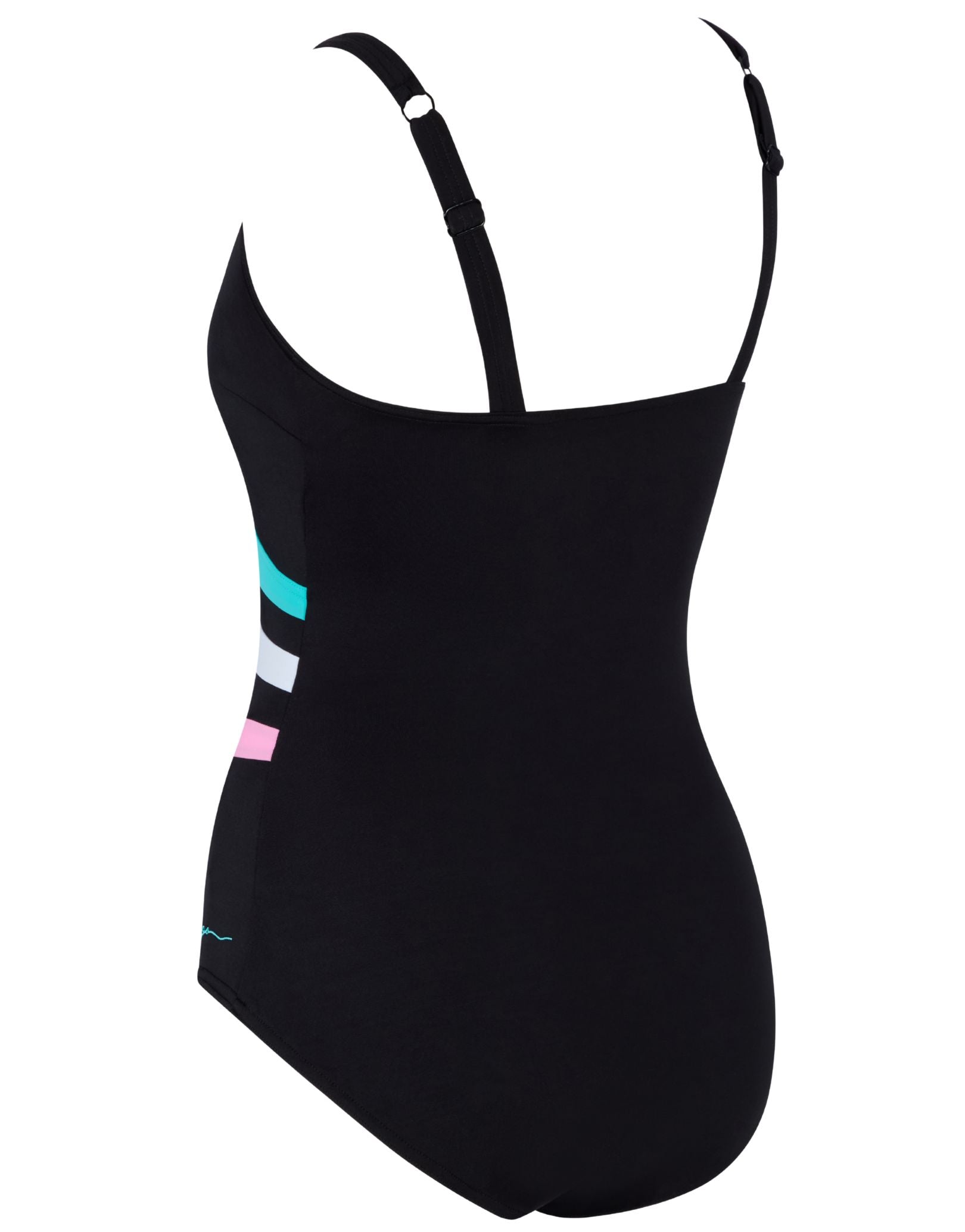Discover timeless elegance with the Plantopia Wrap Panel Classicback Swimsuit by Zoggs. This sophisticated design features a striking black base complemented by diagonal panels in turquoise, white, and soft pink for a flattering silhouette. Engineered with structured foam cups and adjustable straps, it delivers confident support and shaping. The low-cut leg creates an elongating effect, while the classicback style offers freedom of movement. Crafted from durable, chlorine-resistant Ecolast fabric, this swimsuit maintains its colour and integrity through regular pool use, making it a reliable choice for dedicated swimmers seeking both style and performance.
