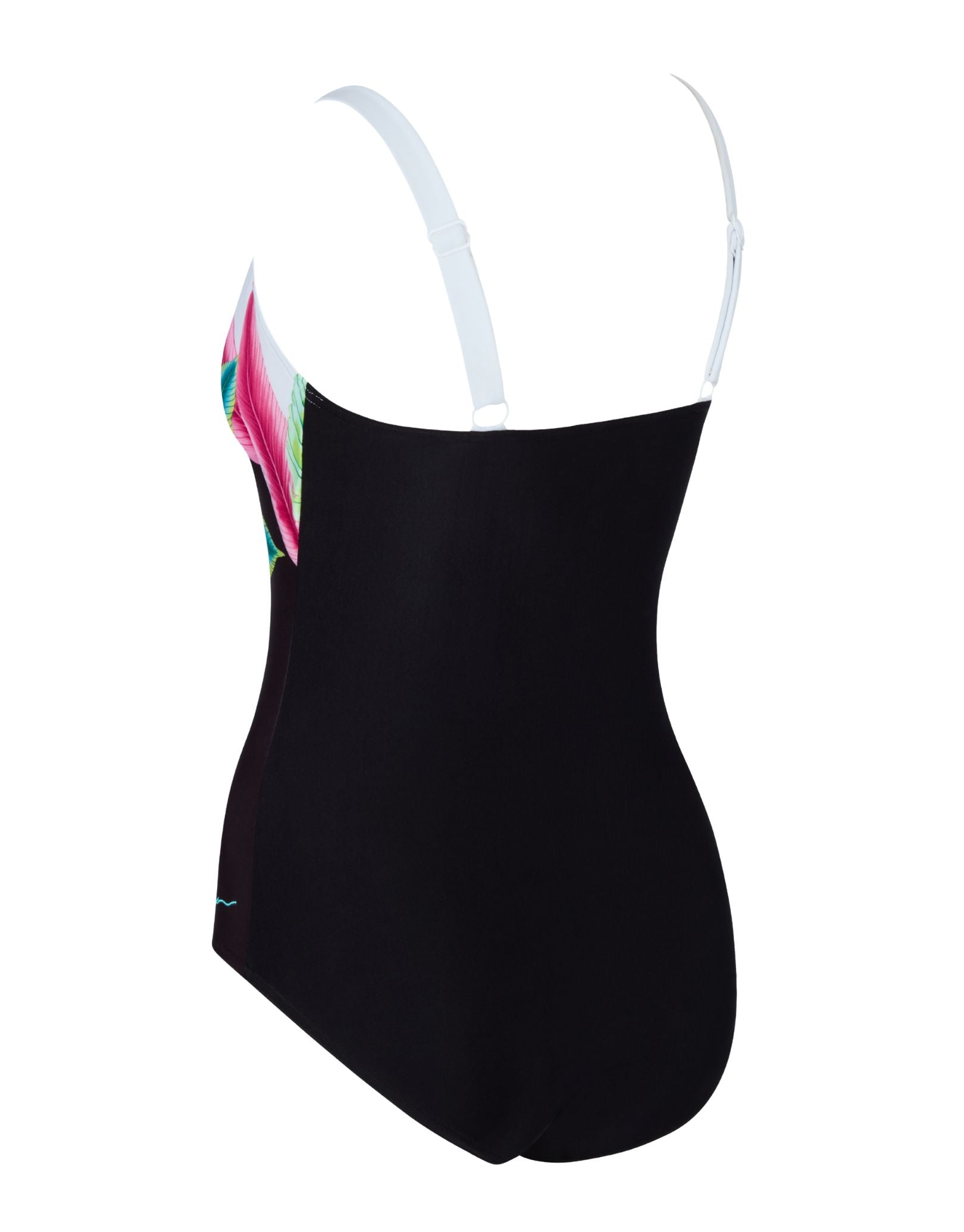 Discover the Plantopia Adjustable Classicback Swimsuit from Zoggs, where style meets performance. This striking swimsuit features a tropical print in greens and pinks to the top of the swimsuit, with white supportive straps, the rest is on a black background. Built with full foam cups and adjustable straps, it delivers the confidence and comfort you need for lap swimming or leisurely poolside moments. Crafted from sustainable Ecolast+™ fabric—made from recycled plastic bottles—this chlorine-resistant swimsuit maintains its vibrant colours and shape season after season. With UPF 50+ sun protection and a low leg cut, you'll enjoy both protection and a flattering fit. Experience Support Level 3 engineering designed to enhance your natural shape while making a positive environmental choice.