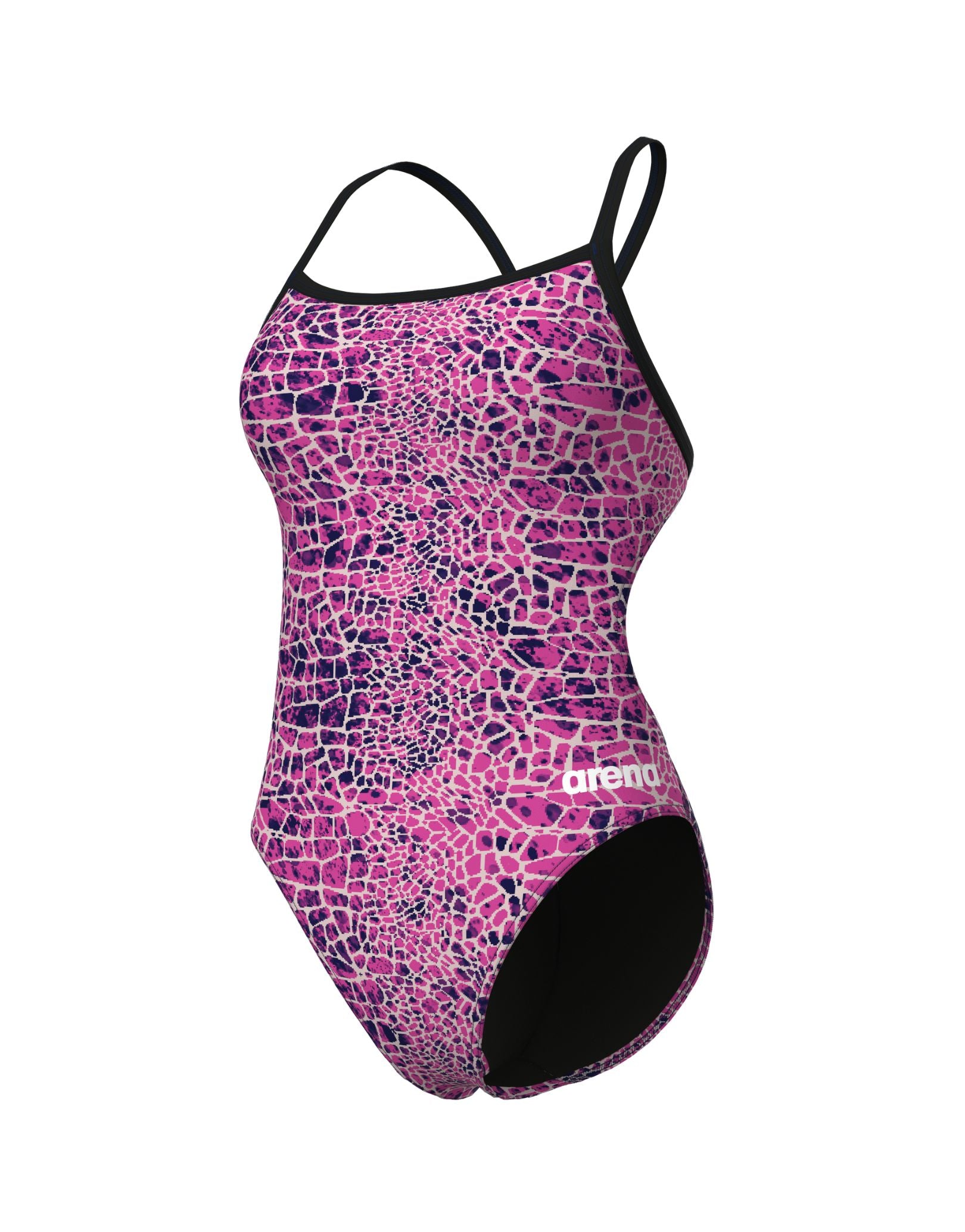 The Snakeskin Challenge Back Swimsuit from Arena features a bold pink snakeskin print with black shoulder straps for a sleek, athletic look. Made from eco-friendly MaxLife Eco fabric, it offers superior chlorine resistance, long-lasting comfort, and 50+ UV protection which is perfect for competitive swimmers and daily training. With at least 50% recycled polyester, this sustainable performance swimsuit combines durability, style, and functionality in every stroke.