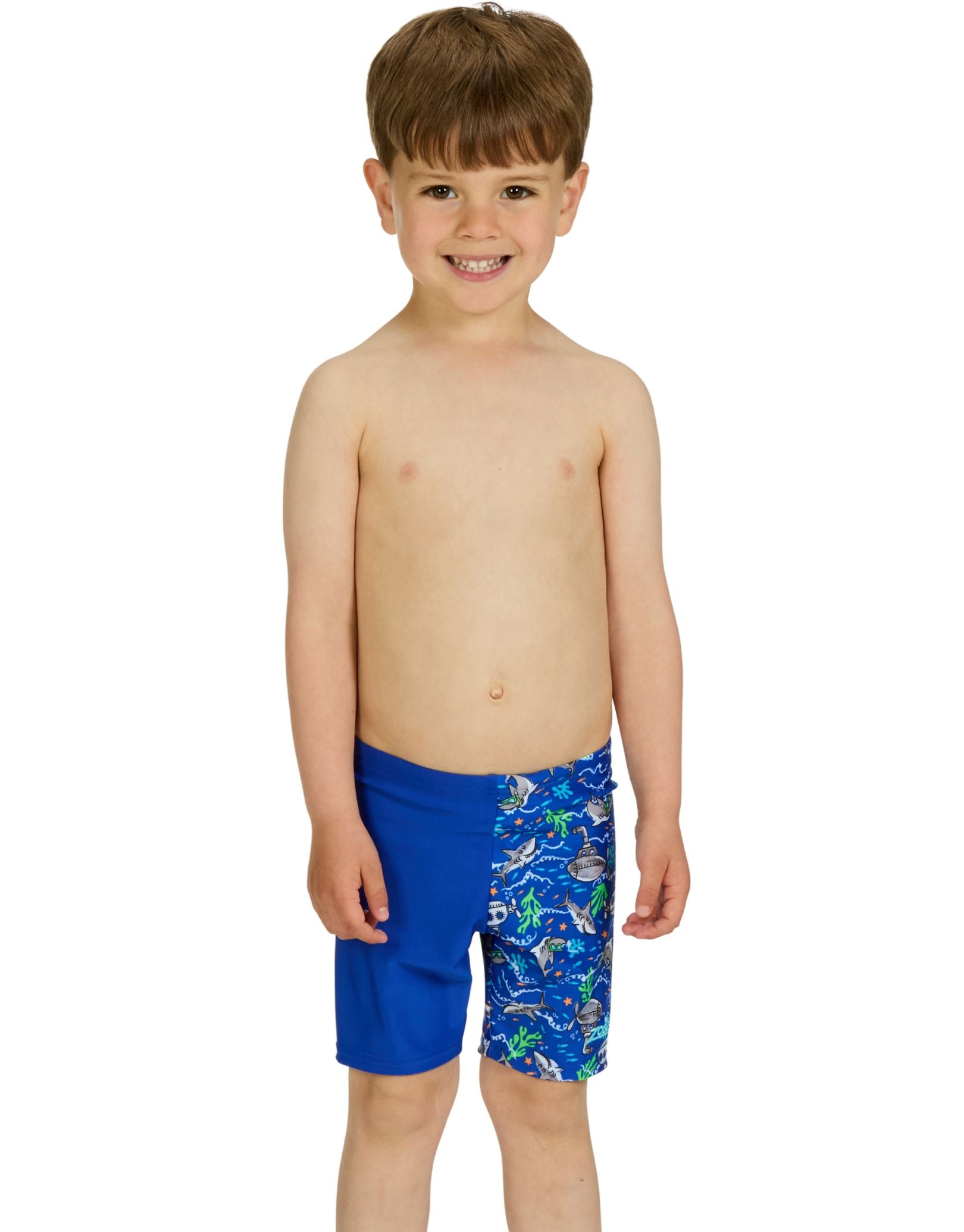 Designed for young swimmers, the Oceanic Tots Boys Jammer from Zoggs, combines durability with engaging style. Featuring vibrant underwater-themed graphics of sharks and submarines along one leg, this blue jammer captures children's imagination while they learn. Constructed from Ecolast fabric, it delivers exceptional chlorine resistance and maintains its shape through repeated wear—ideal for swimming lessons, pool sessions, and seaside adventures alike.